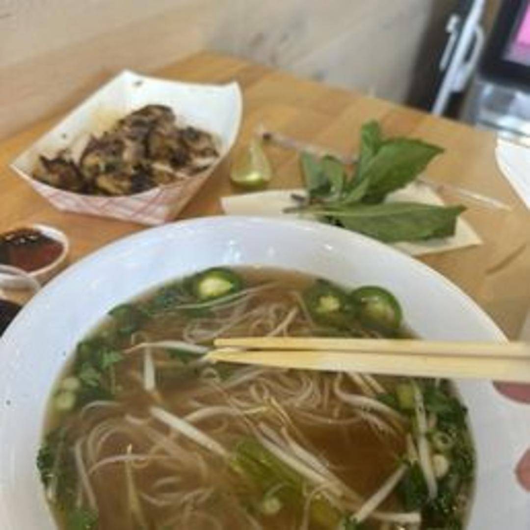 Vietnamese noodle soup featuring a flavorful broth, rice noodles, and tender grilled chicken. Served with a side of bean sprouts, basil, lime, and jalapenos.