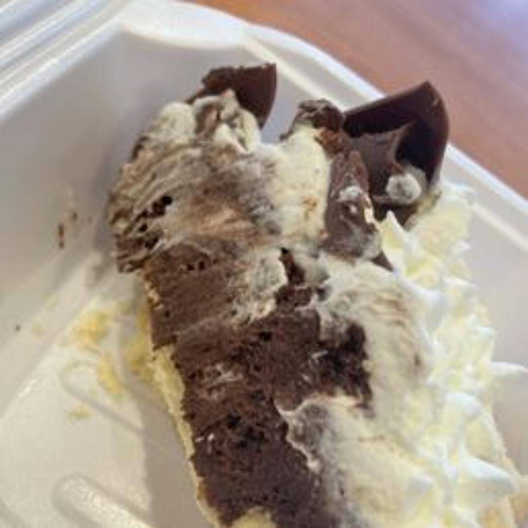 A rich and creamy chocolate filling in a flaky pastry crust, topped with a generous layer of whipped cream and chocolate shavings.