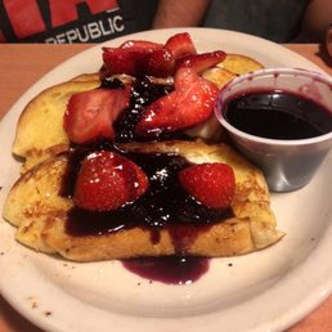 Thick slices of Texas toast dipped in a sweet batter and grilled golden brown. Served with warm syrup and dusted with powdered sugar.