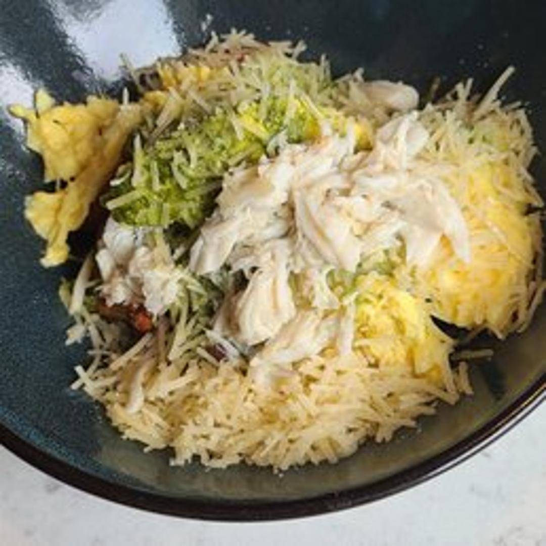 Fluffy scrambled eggs infused with vibrant pesto and succulent crab meat. A flavorful and satisfying breakfast or brunch option.