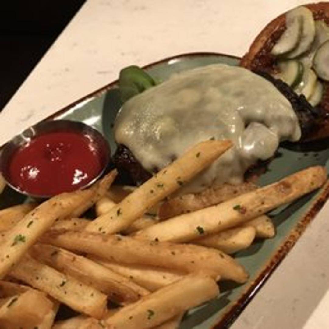 A classic burger featuring a juicy beef patty, topped with crisp lettuce, ripe tomato, and your choice of cheese on a toasted bun. Served with a side of crispy fries.