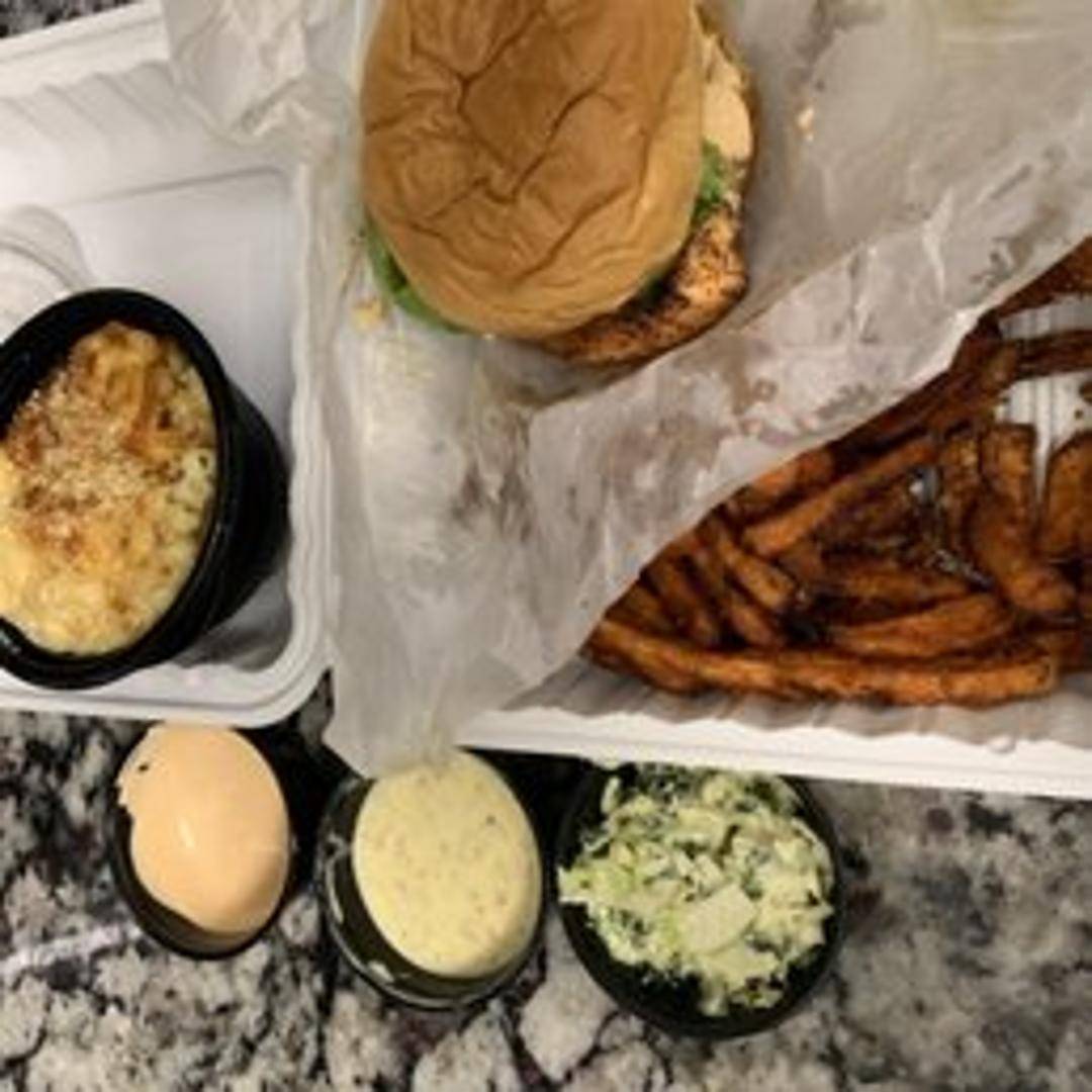 Flaky blackened salmon served on a toasted bun with lettuce, tomato, and a creamy remoulade sauce. Served with your choice of side.