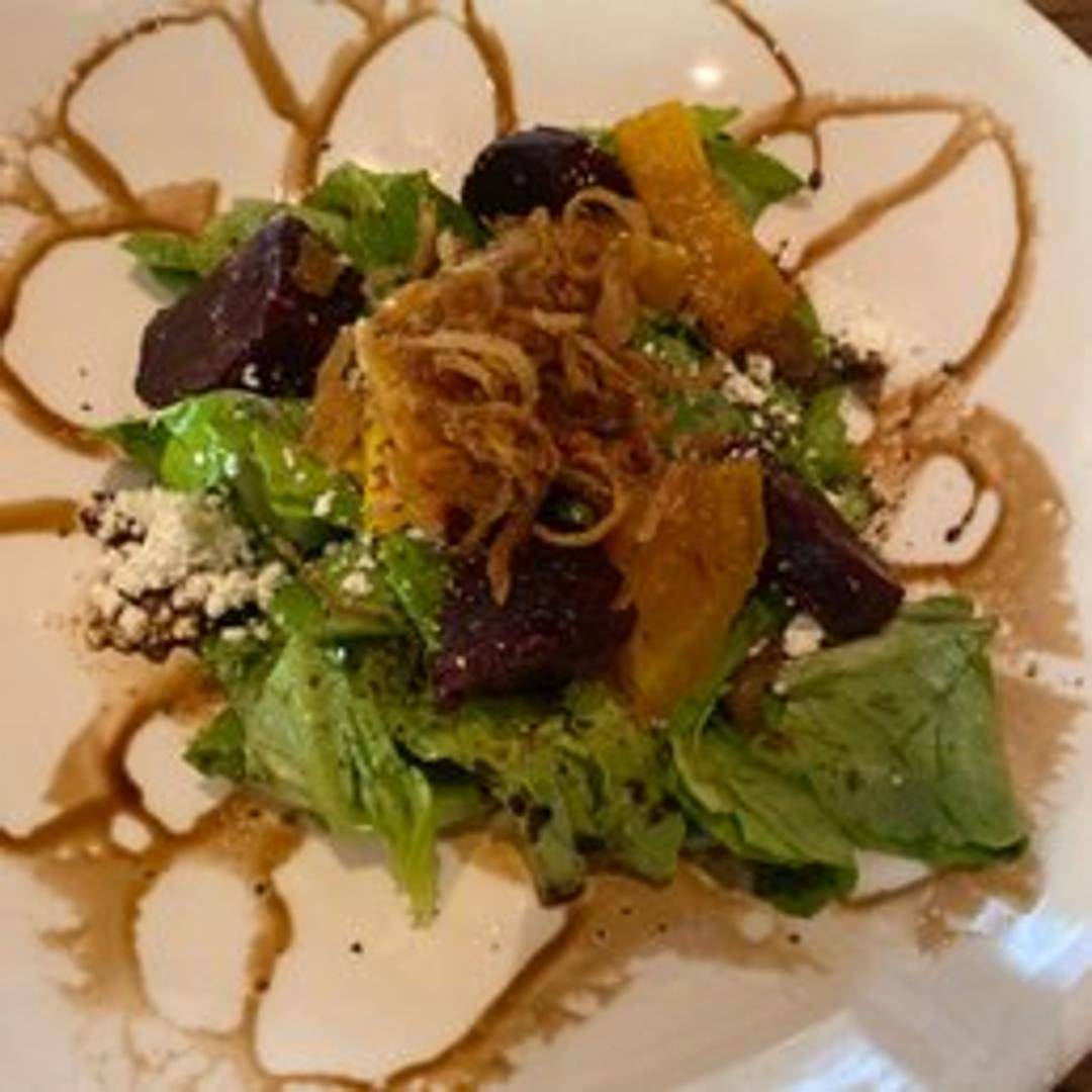 A vibrant salad featuring roasted beets, mixed greens, crumbled goat cheese, candied walnuts, and a light vinaigrette dressing.