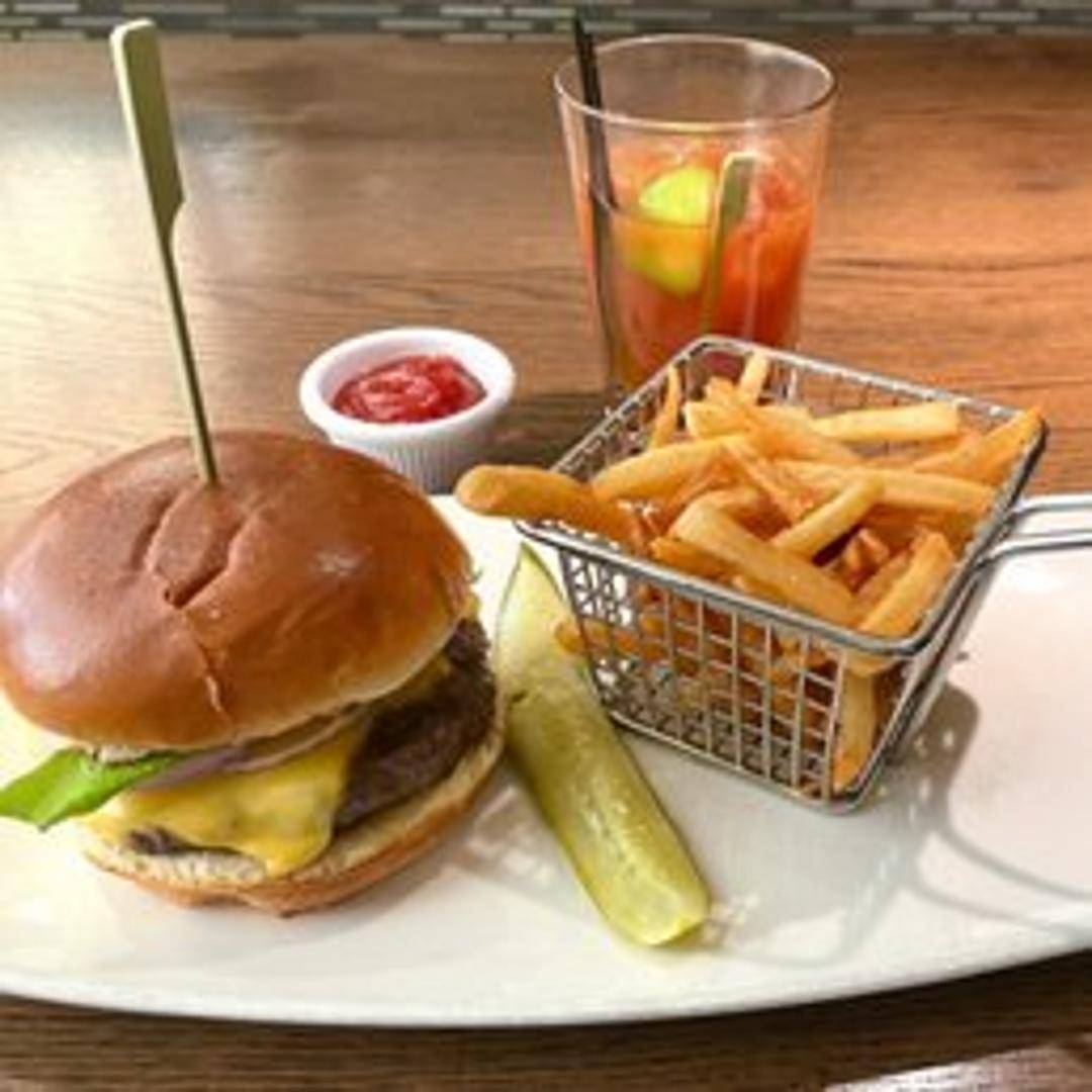 Our juicy, perfectly grilled beef patty crowned with your choice of melted cheese, crisp lettuce, ripe tomato, fresh onion, and tangy pickles. All served on a lightly toasted bun, creating the ultimate American classic. Accompanied by crispy fries.