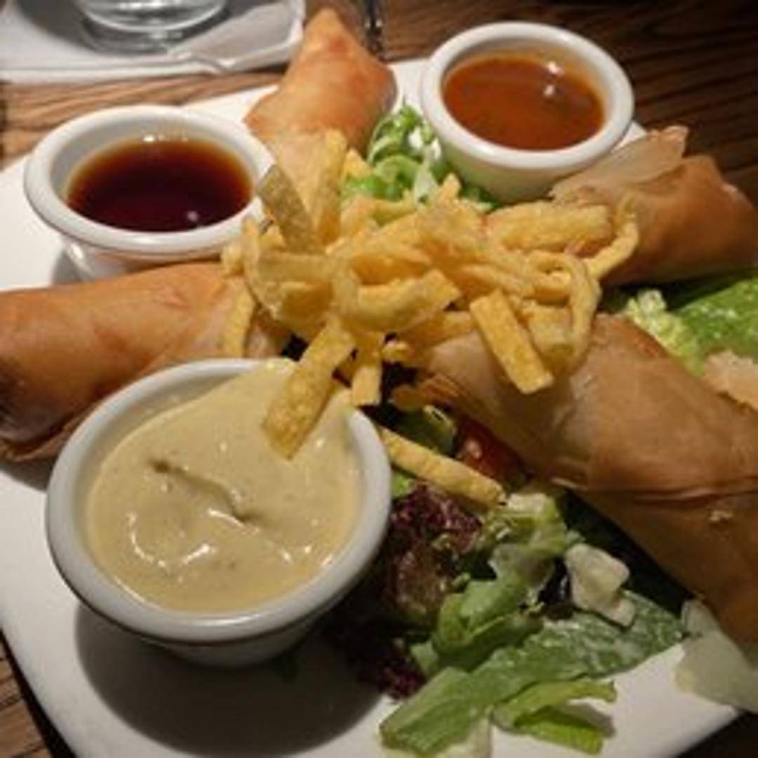 Crispy fried rolls filled with seasoned vegetables and served with a dipping sauce.