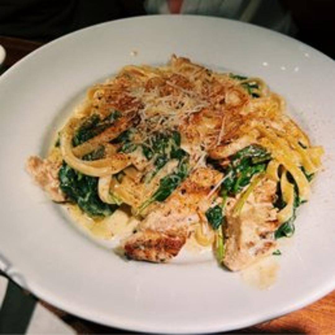Grilled chicken breast seasoned with blackened spices, served over fettuccine pasta tossed in a creamy Alfredo sauce. Garnished with parsley and Parmesan cheese.
