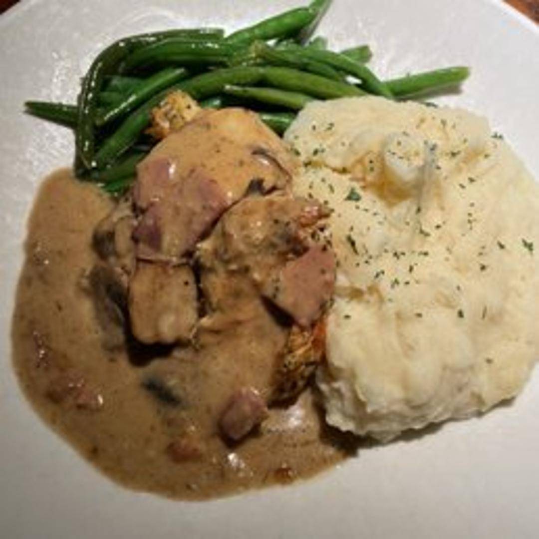 Pan-seared chicken cutlets in a rich Marsala wine sauce with mushrooms, served with a side of pasta or mashed potatoes.