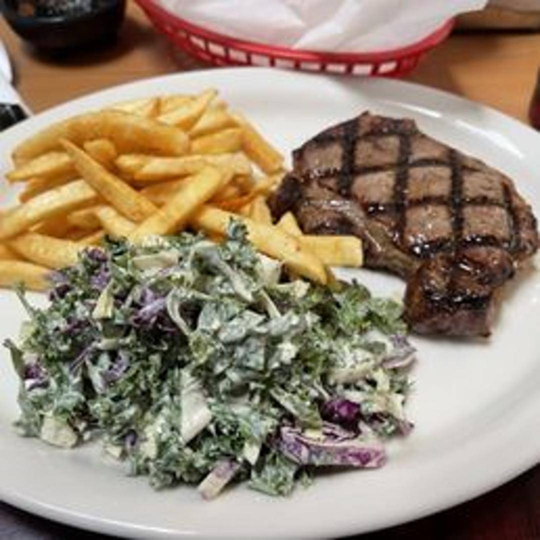 A grilled ribeye steak, cooked to your desired temperature. Served with your choice of sides.