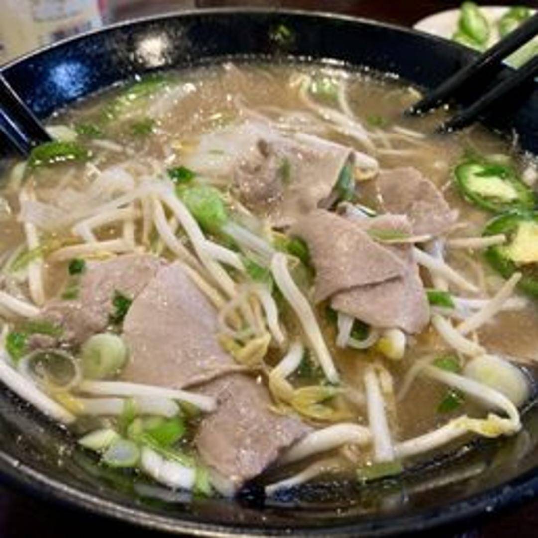Traditional Vietnamese noodle soup featuring a flavorful beef broth, rice noodles, and thinly sliced, rare steak that cooks in the hot broth. Garnished with onions, cilantro, and bean sprouts, typically served with lime wedges, chili peppers, and hoisin and sriracha sauces on the side.