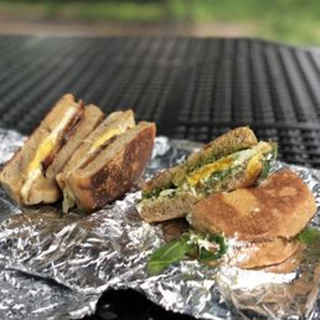A sweet and satisfying breakfast treat showcasing a warm, flaky biscuit filled with creamy maple butter and a sprinkle of sea salt for a delightful balance of sweet and salty.
