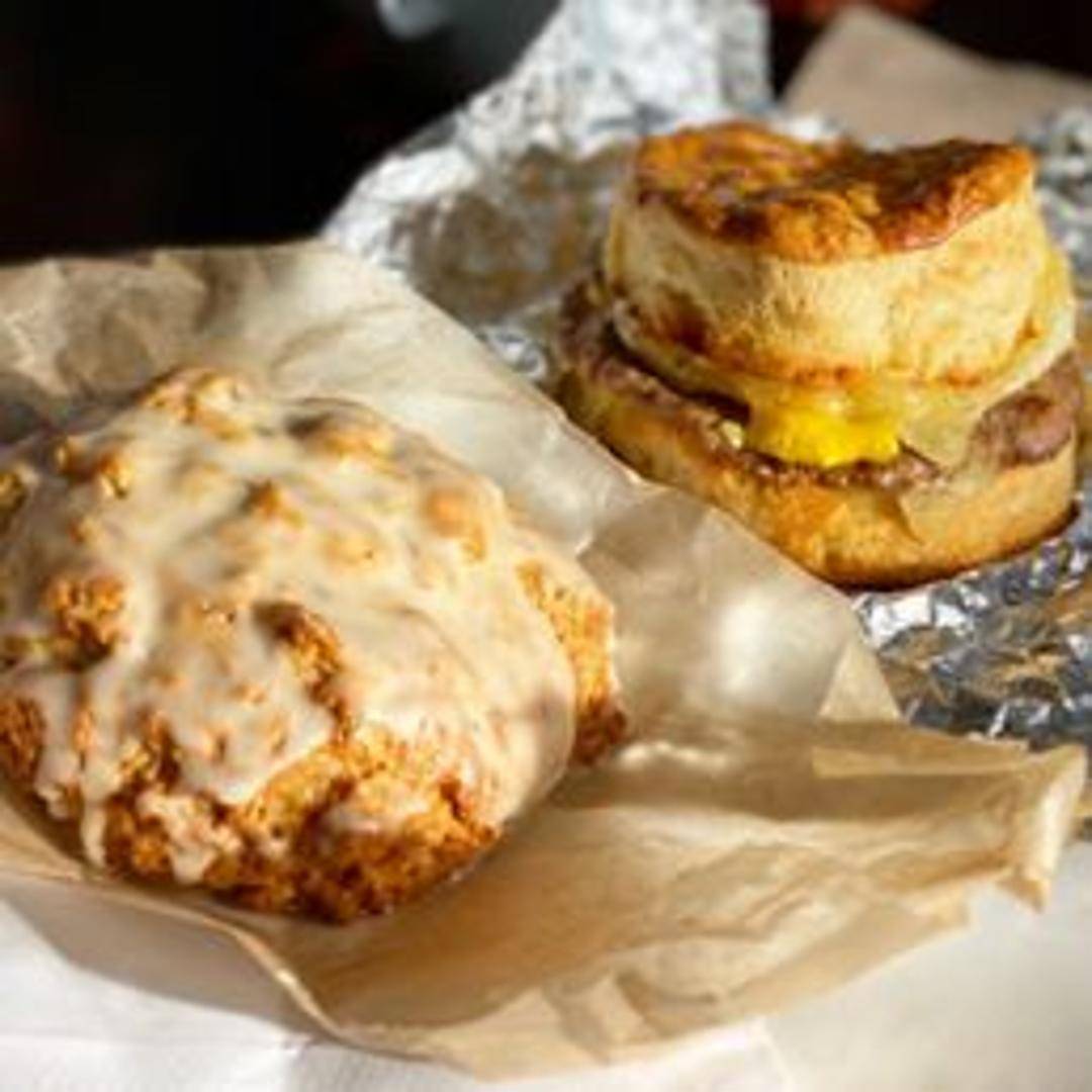 A hearty and savory breakfast sandwich built with a juicy, house-made sausage patty, a fried egg with a runny yolk, and sharp cheddar cheese, stacked on a griddled English muffin.