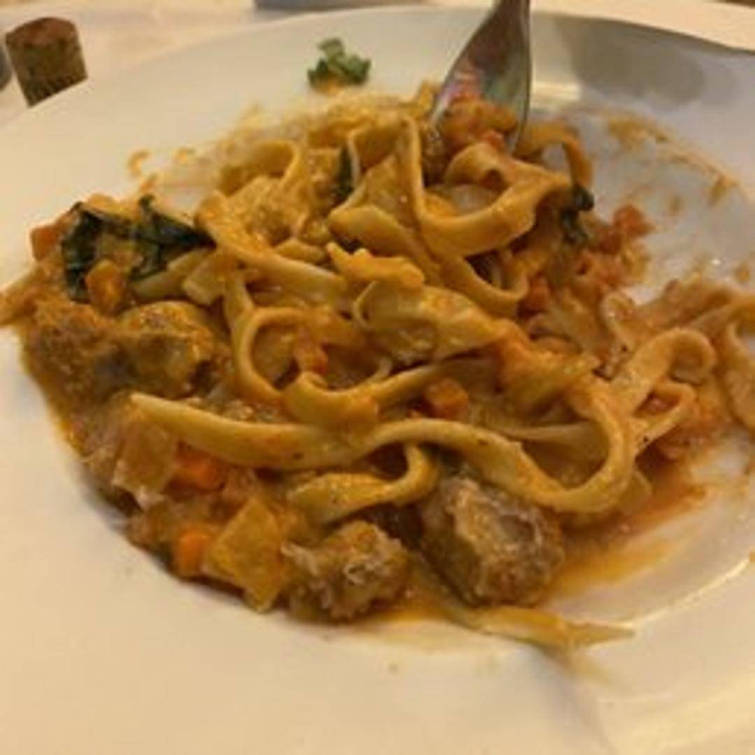 Wide fettuccine pasta tossed in a rich and savory meat sauce made with ground beef, tomatoes, herbs, and a touch of cream. A hearty and comforting Italian classic.
