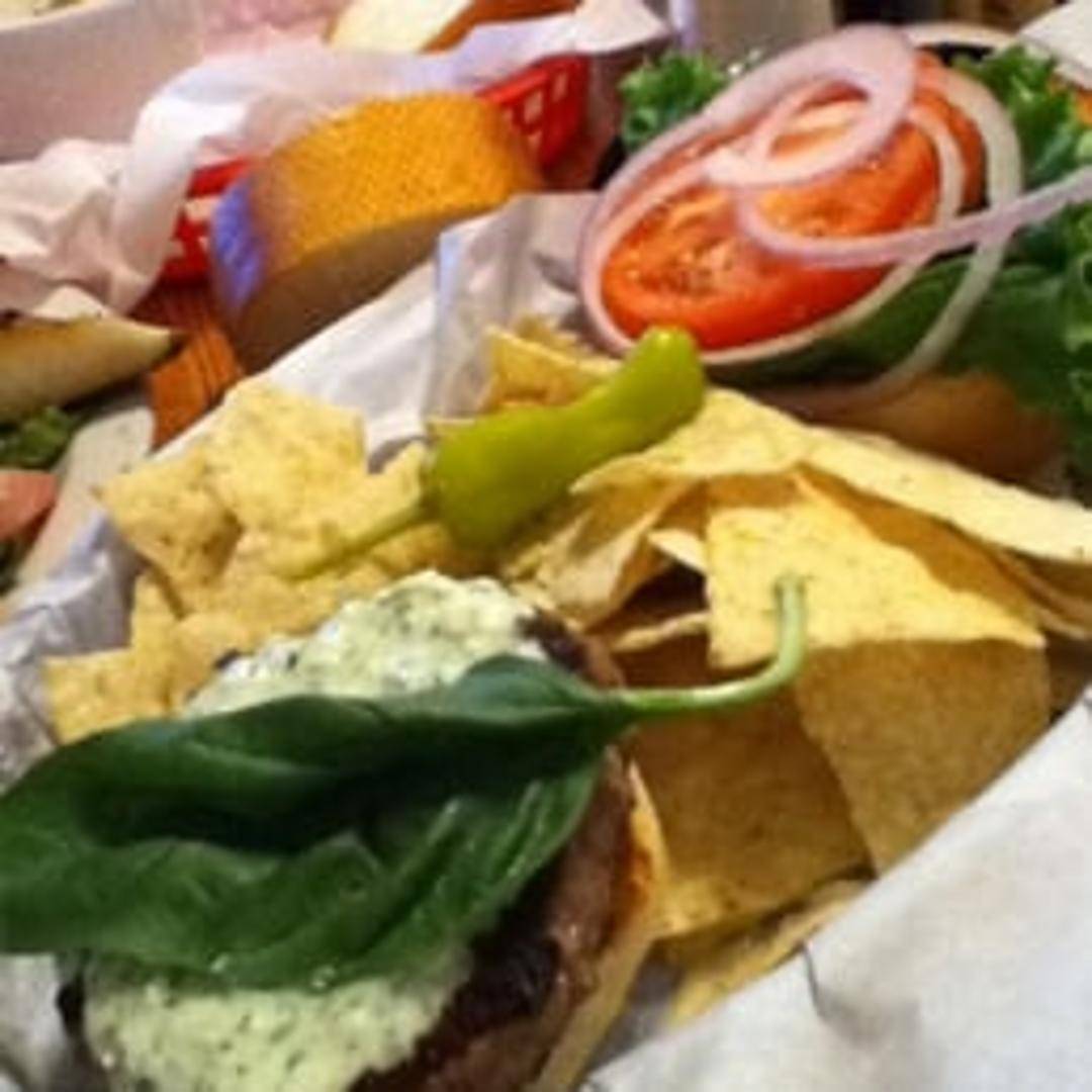 A juicy beef patty topped with crumbled blue cheese, fresh basil, lettuce, tomato, and onion on a toasted bun.
