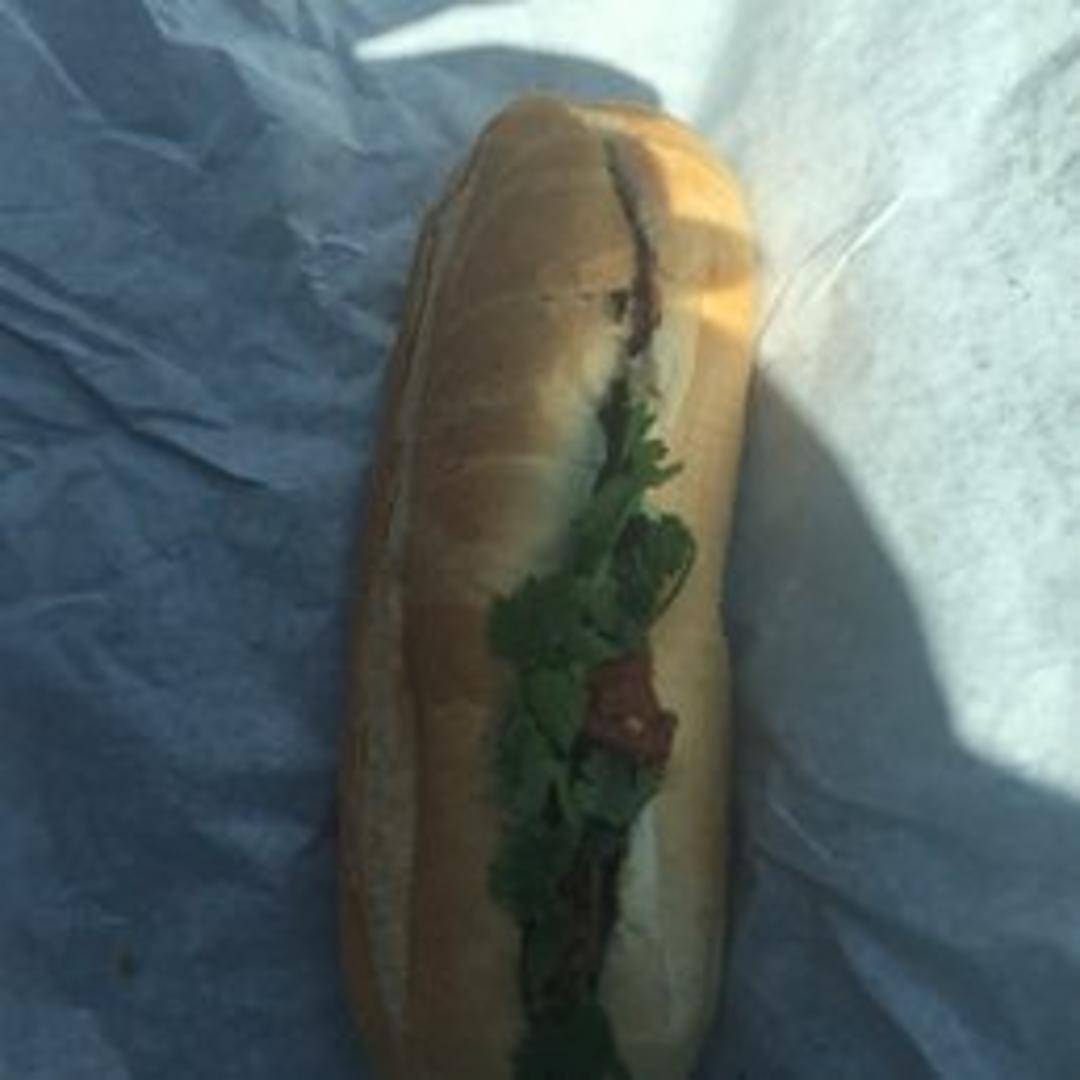 A vegetarian Vietnamese sandwich with savory tofu, pate, mayonnaise, pickled carrots and daikon radish, cilantro, and jalapenos, served on a crispy baguette.