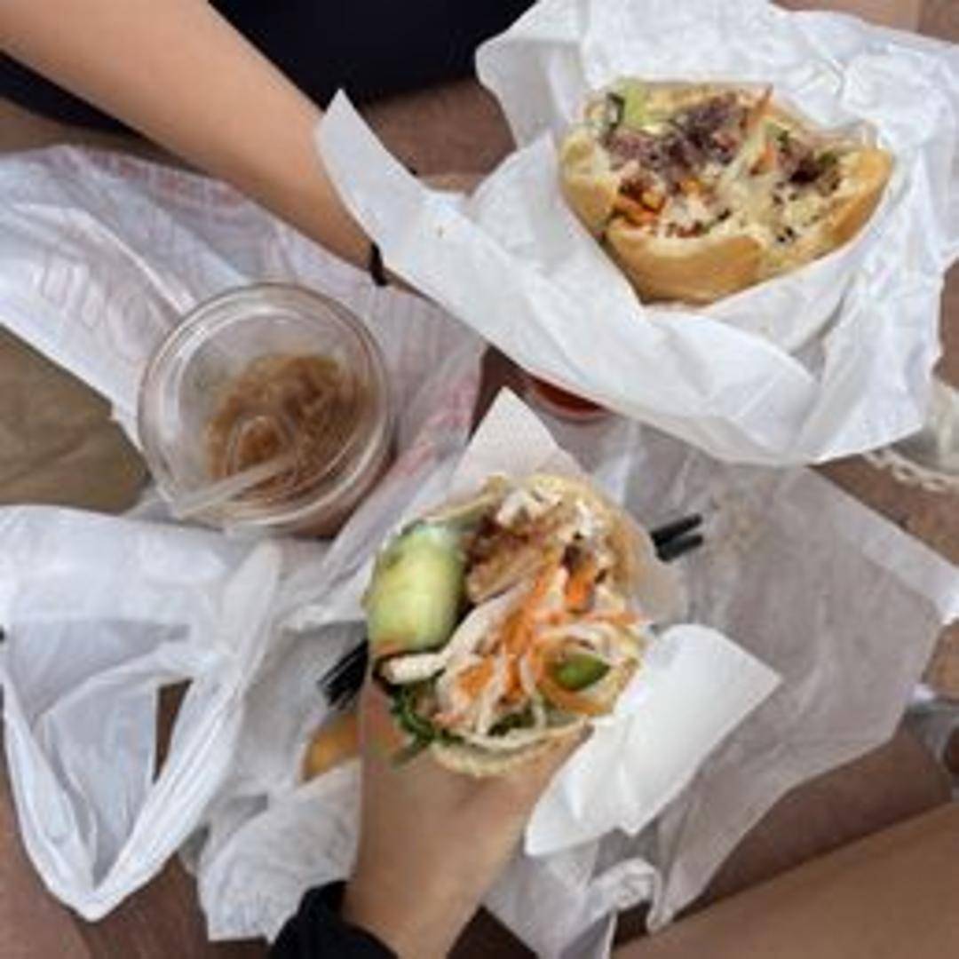 A flavorful sandwich featuring tender pork belly, pate, mayonnaise, pickled carrots and daikon radish, cilantro, and jalapenos, served on a toasted bread.
