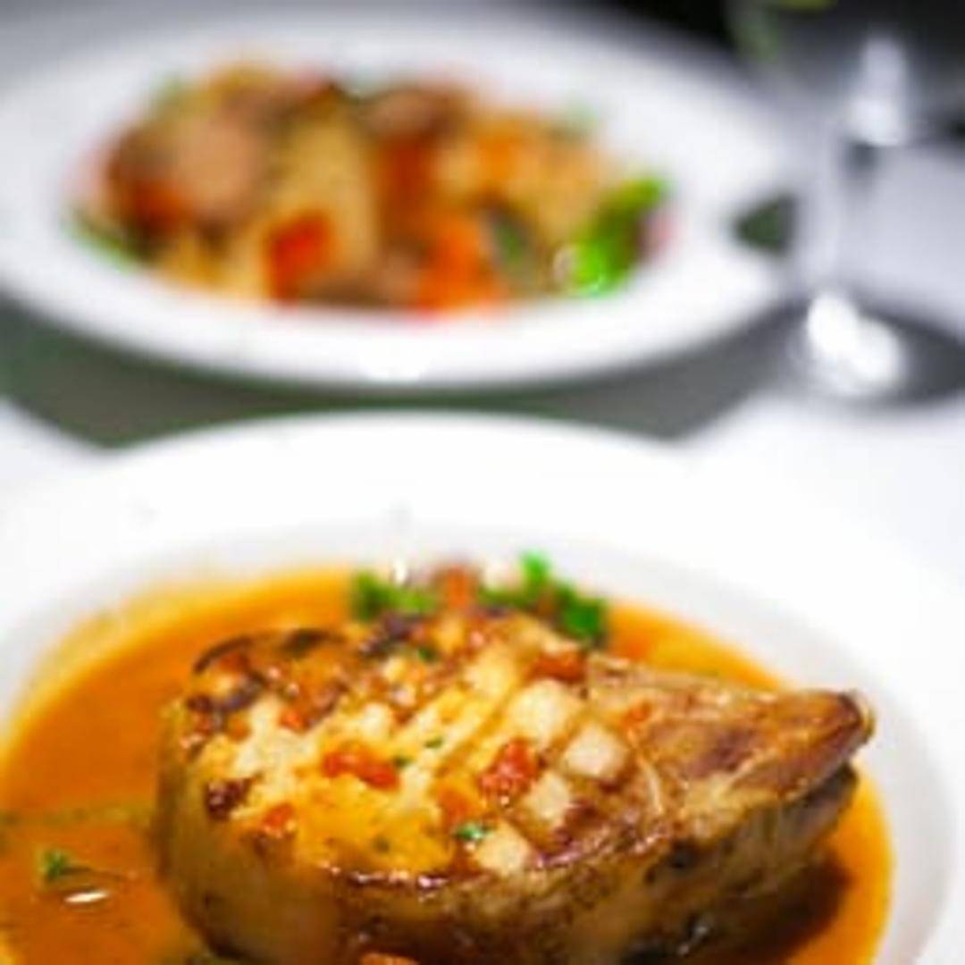 Two thick-cut, bone-in pork chops, pan-seared to perfection and served with a rich marsala wine sauce and roasted potatoes. A hearty and satisfying entree.