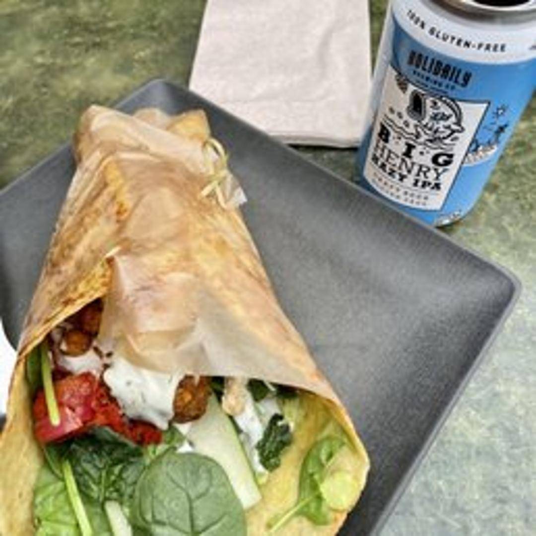 Warm pita bread filled with crispy falafel balls, hummus, tahini sauce, and fresh vegetables like lettuce, tomatoes, cucumbers, and pickled onions. Offers a combination of crispy, creamy, and fresh flavors.