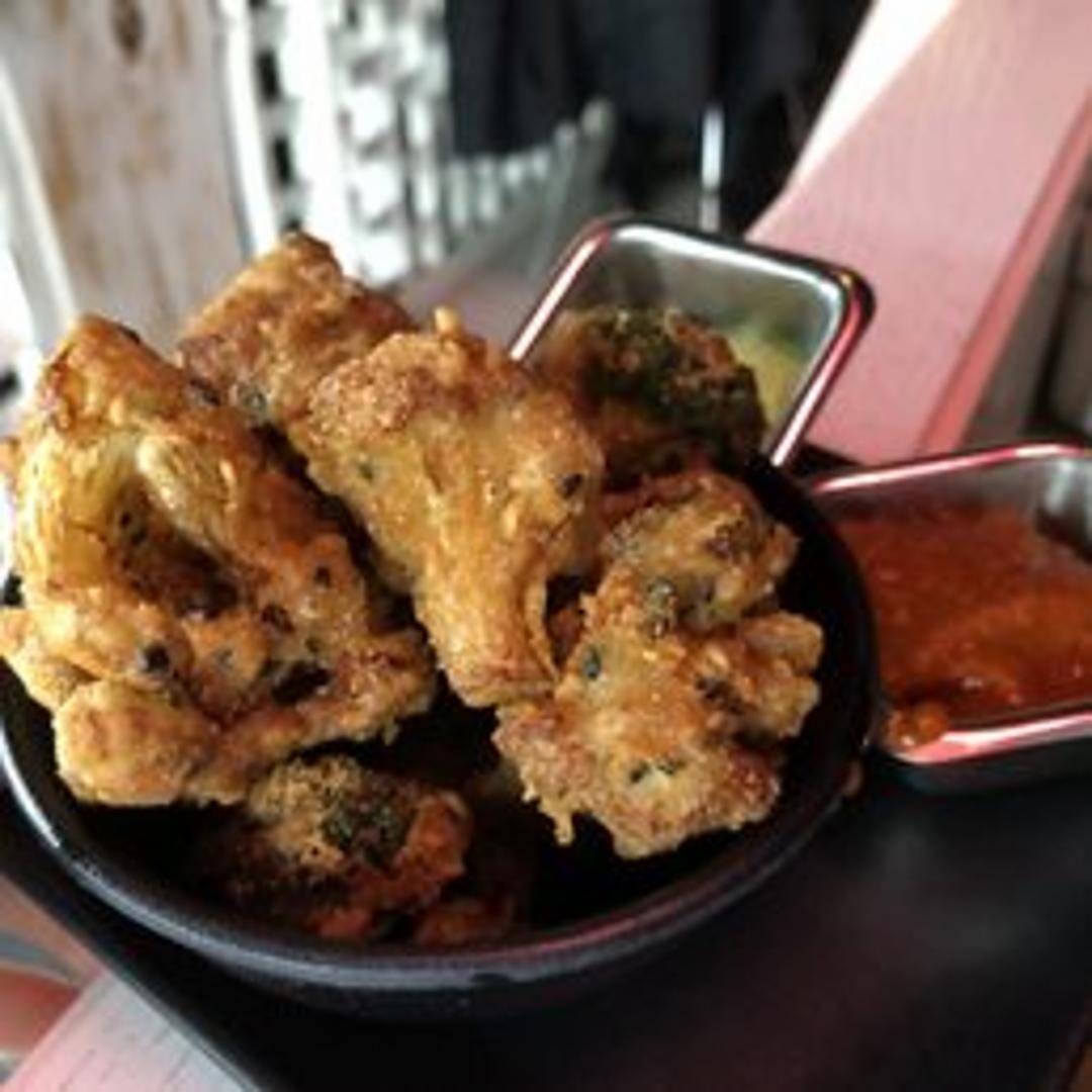 Plant-based wings, often made from cauliflower or other vegetables, that are battered and fried until crispy. Tossed in your choice of sauce (e.g., Buffalo, BBQ, Teriyaki). Served with a dipping sauce like ranch or blue cheese.