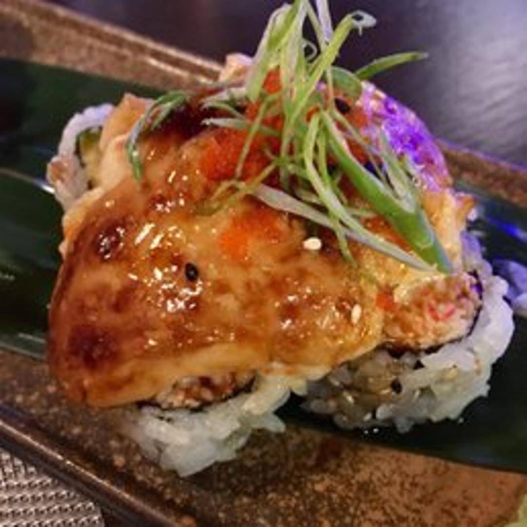 A signature roll featuring a combination of tempura shrimp, cream cheese, and avocado, topped with spicy tuna, crunch, and a sweet eel sauce. A harmonious blend of textures and flavors, combining creamy, crunchy, spicy, and sweet elements.