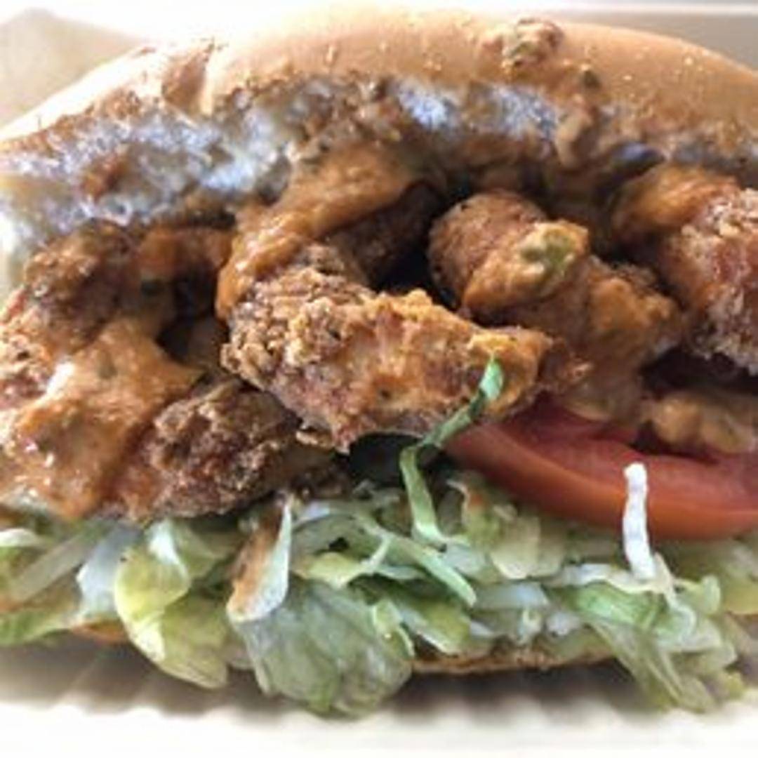 A New Orleans classic made vegan! Crispy, flavorful plant-based shrimp served on a toasted po' boy bun with shredded lettuce, tomatoes, pickles, and a zesty remoulade sauce.