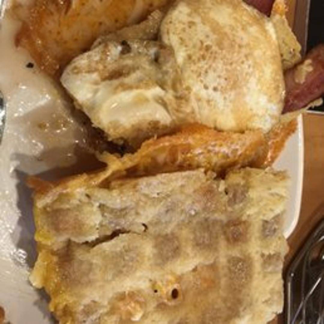 A savory breakfast sandwich featuring your choice of protein, cheese, and toppings, all nestled between two delicious waffles.
