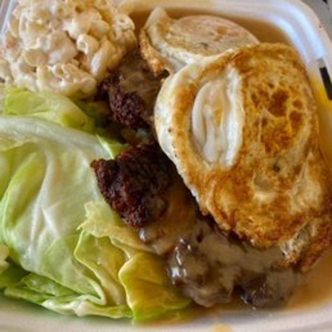Steamed rice topped with a hamburger patty, fried egg, and smothered in rich gravy.