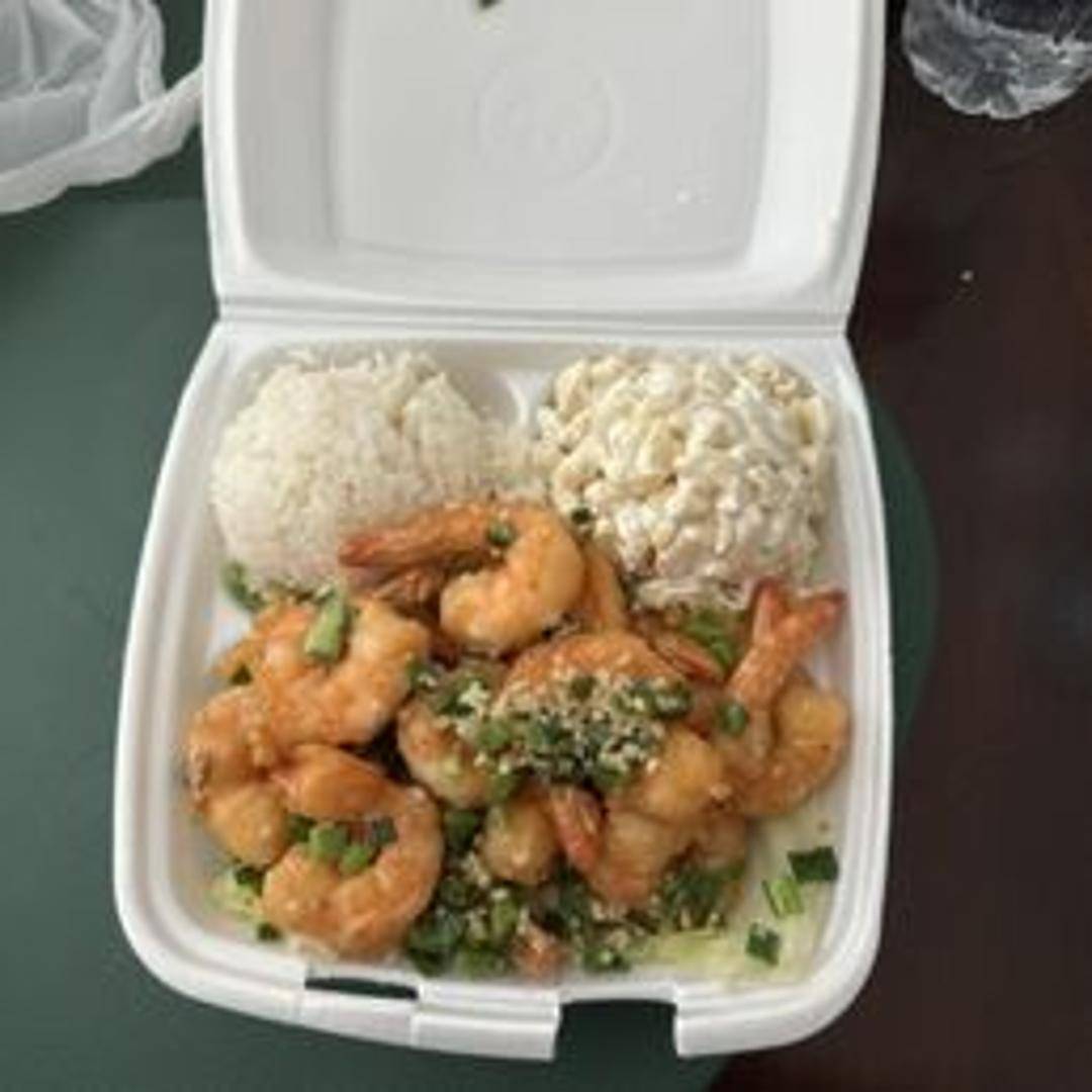 Shrimp sautéed in garlic butter served with steamed rice and macaroni salad.