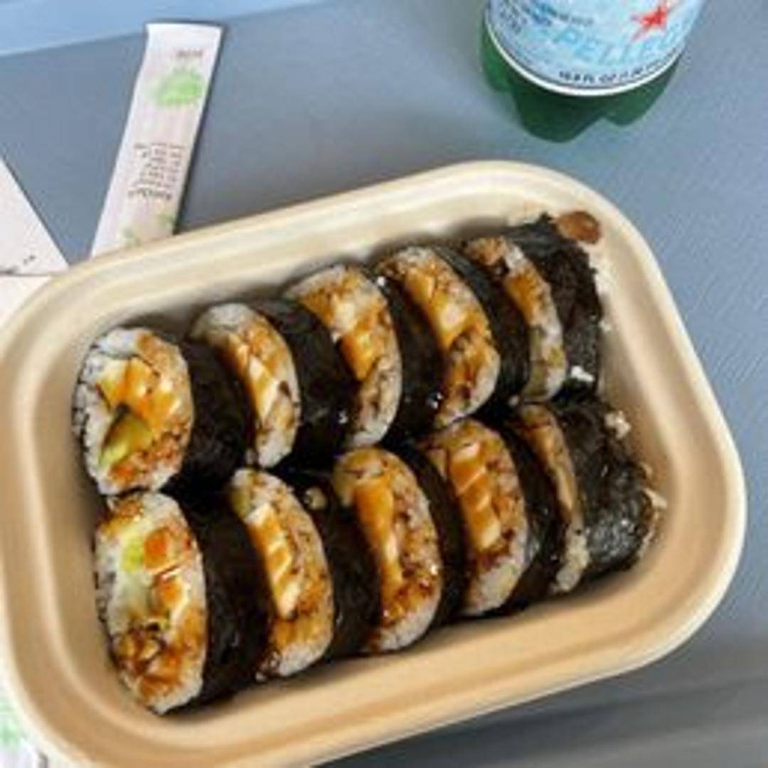 A refreshing sushi roll featuring a variety of fresh vegetables, wrapped in seaweed and sushi rice. Contains cucumber, avocado, carrots, and other seasonal greens. Served with a side of soy sauce and ginger.