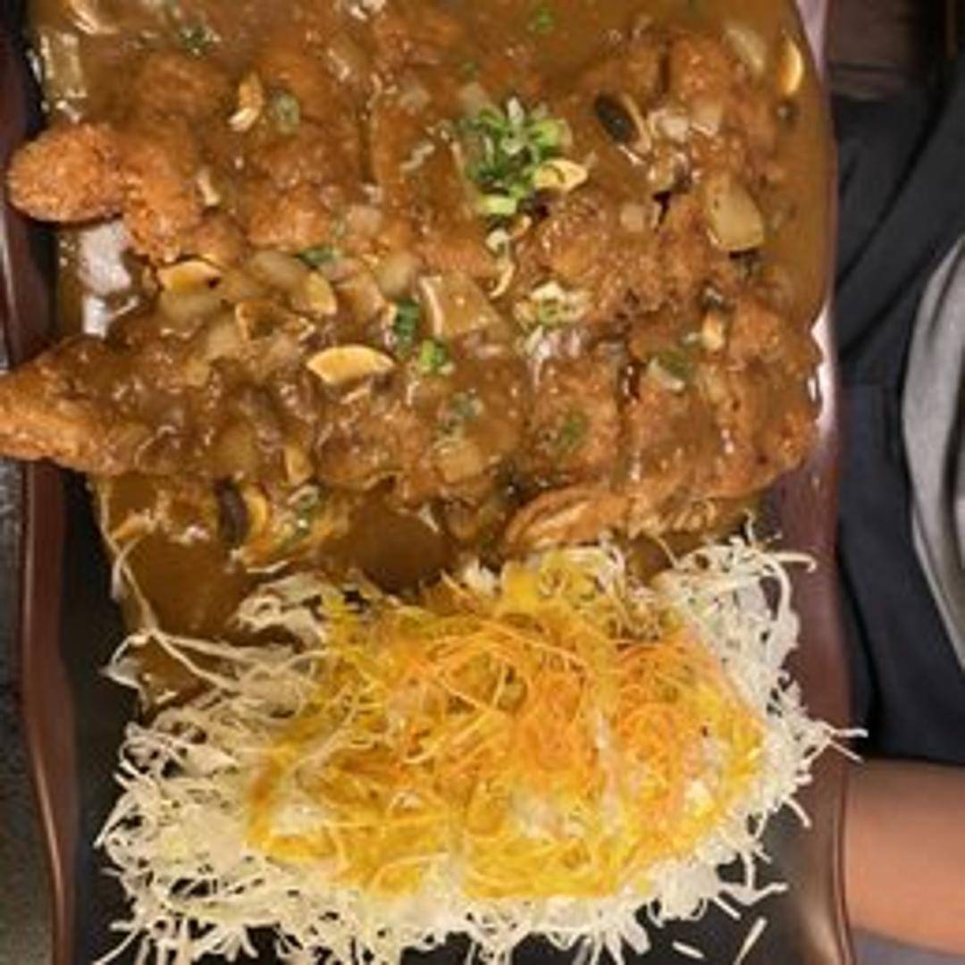 A flavorful Japanese curry featuring tender pieces of breaded and deep-fried pork cutlet (tonkatsu) simmered in a rich and savory curry sauce. Served with a side of steamed rice.