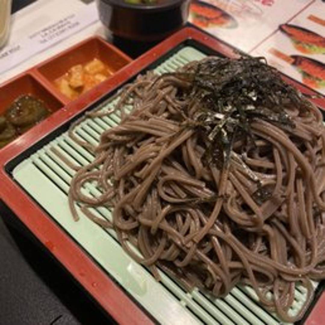 Chilled buckwheat noodles served with a dipping sauce, typically containing soy sauce, mirin, dashi, and green onions. Often garnished with nori seaweed and wasabi.