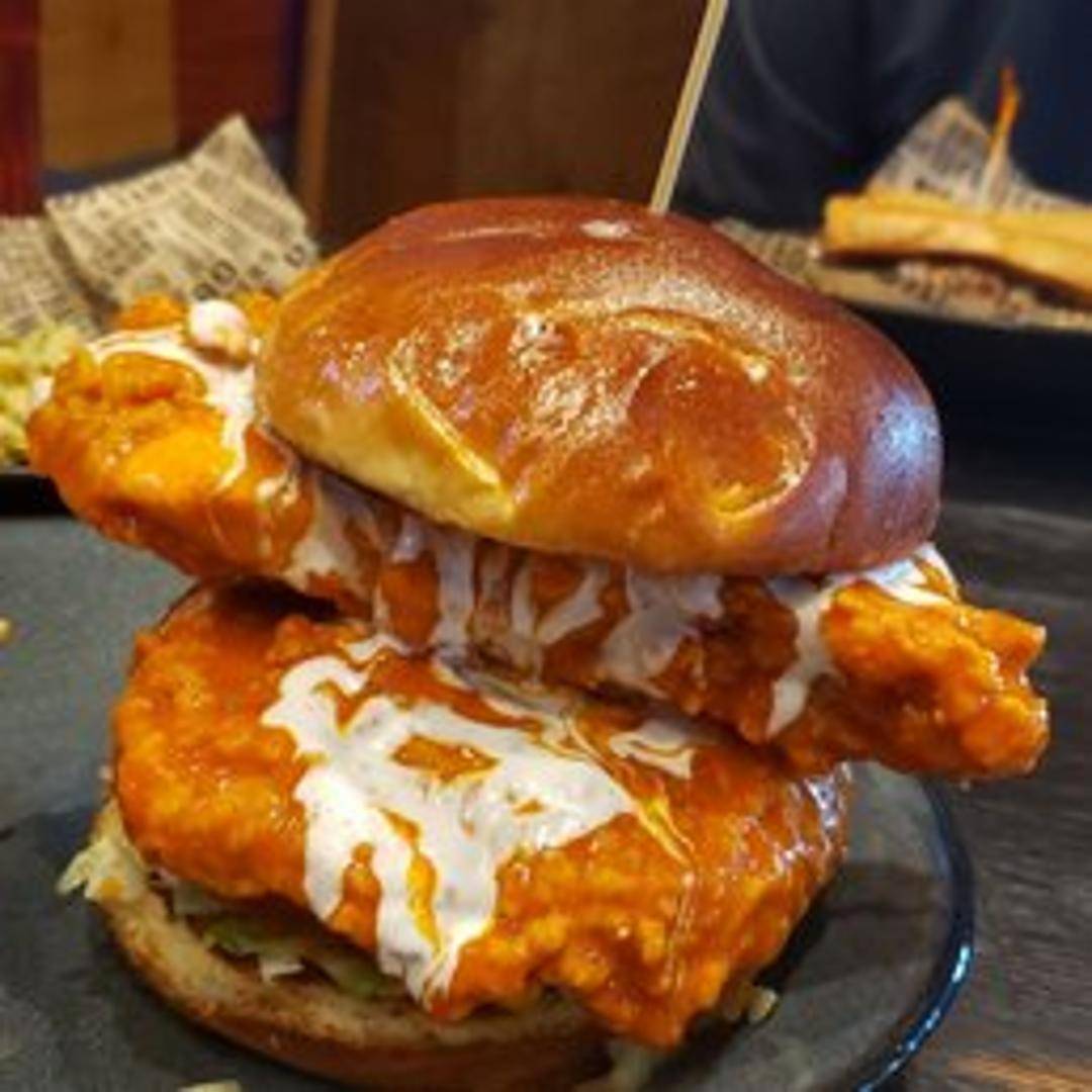 Crispy fried chicken breast tossed in buffalo sauce with lettuce, tomato, and your choice of ranch or bleu cheese dressing served on a toasted brioche bun.