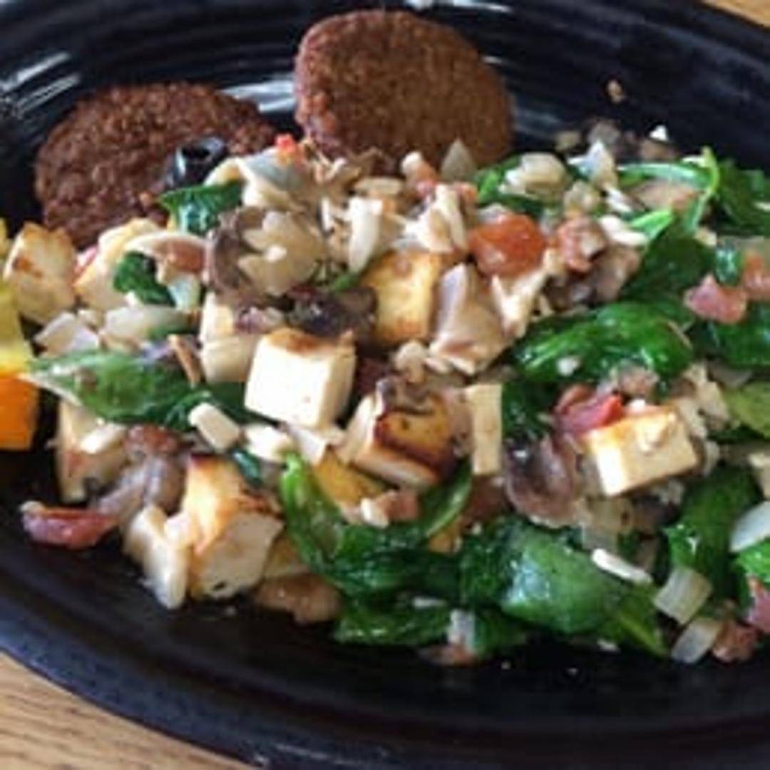 A hearty scramble of eggs with a variety of vegetables, cheeses, and protein. Likely includes local ingredients and is a signature dish of the restaurant.