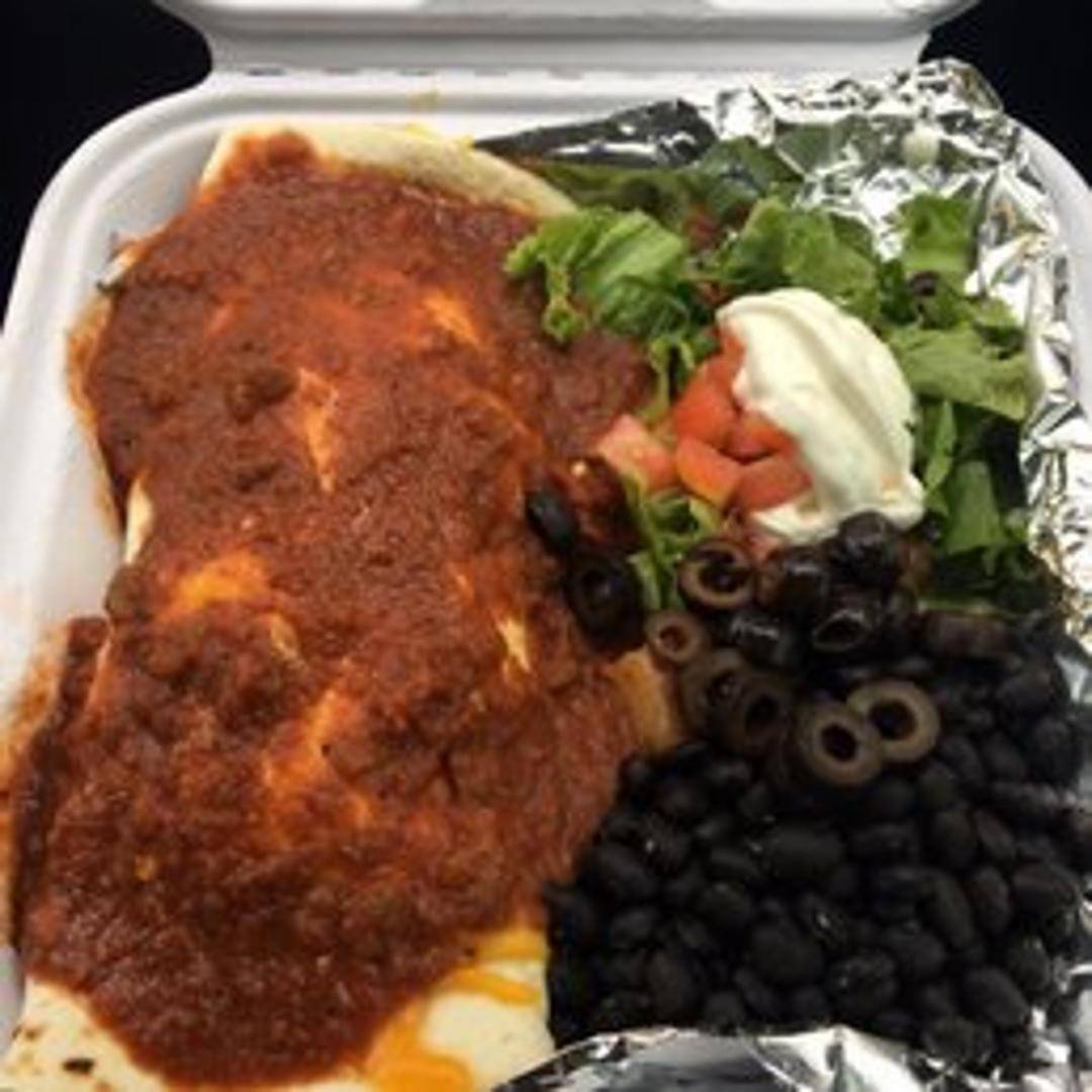 A large flour tortilla filled with scrambled eggs, potatoes, cheese, and often meat (like sausage or bacon), and frequently topped with green chile or salsa.