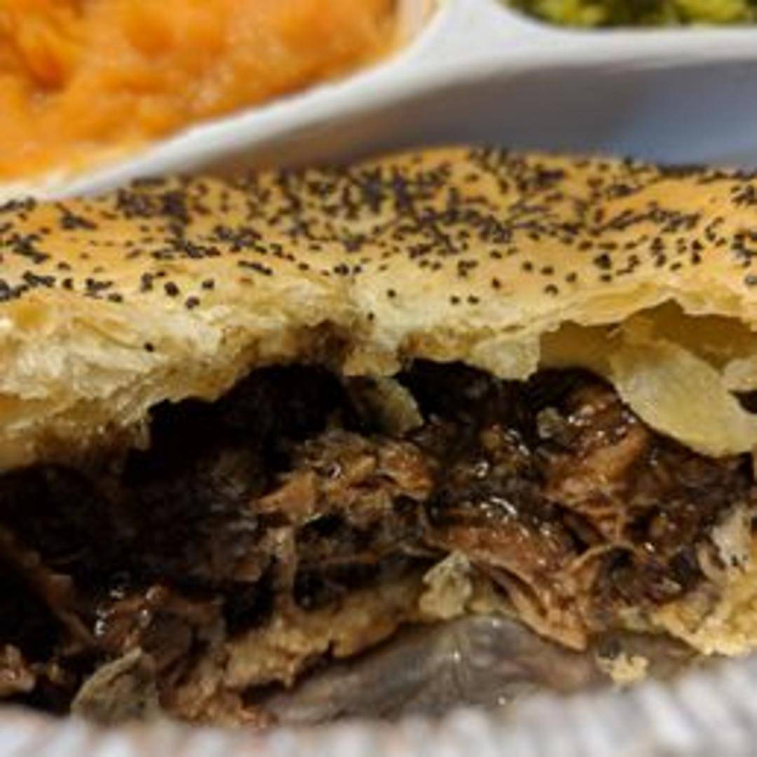 A traditional savoury pie consisting of assorted meats in a rich gravy, all encased in a flaky and buttery crust.