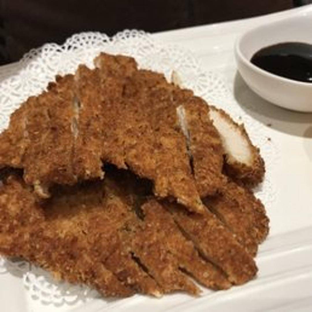 A classic Japanese dish featuring a crispy, golden-brown chicken cutlet, expertly breaded with panko crumbs and deep-fried to perfection, ensuring a tender and juicy interior. Often served with a tangy tonkatsu sauce and a side of shredded cabbage.