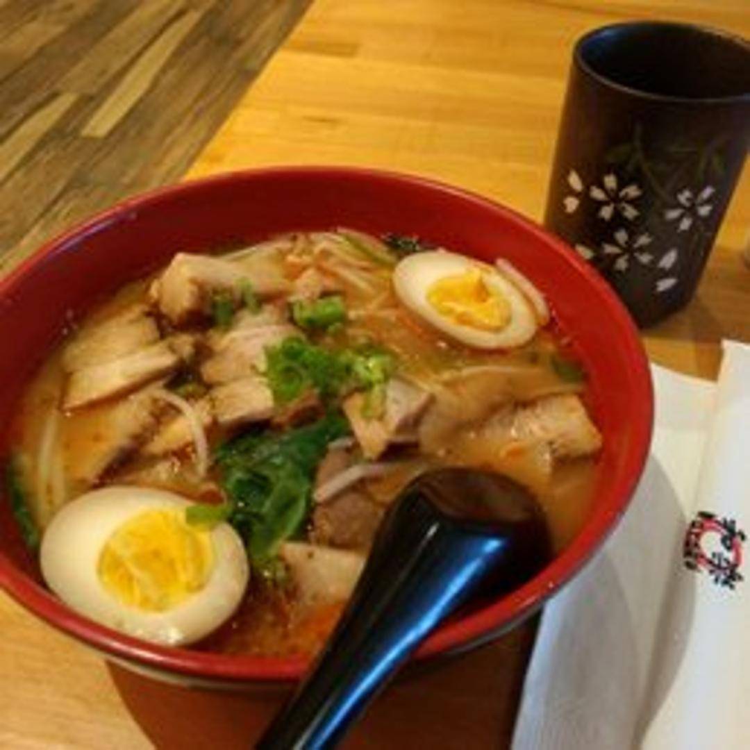 A comforting and robust bowl of authentic ramen featuring a rich, savory miso-based broth infused with a delightful spicy kick. Served with bouncy ramen noodles, tender chashu pork slices, a perfectly soft-boiled egg, fresh scallions, and other traditional toppings, delivering a warming and deeply flavorful experience.