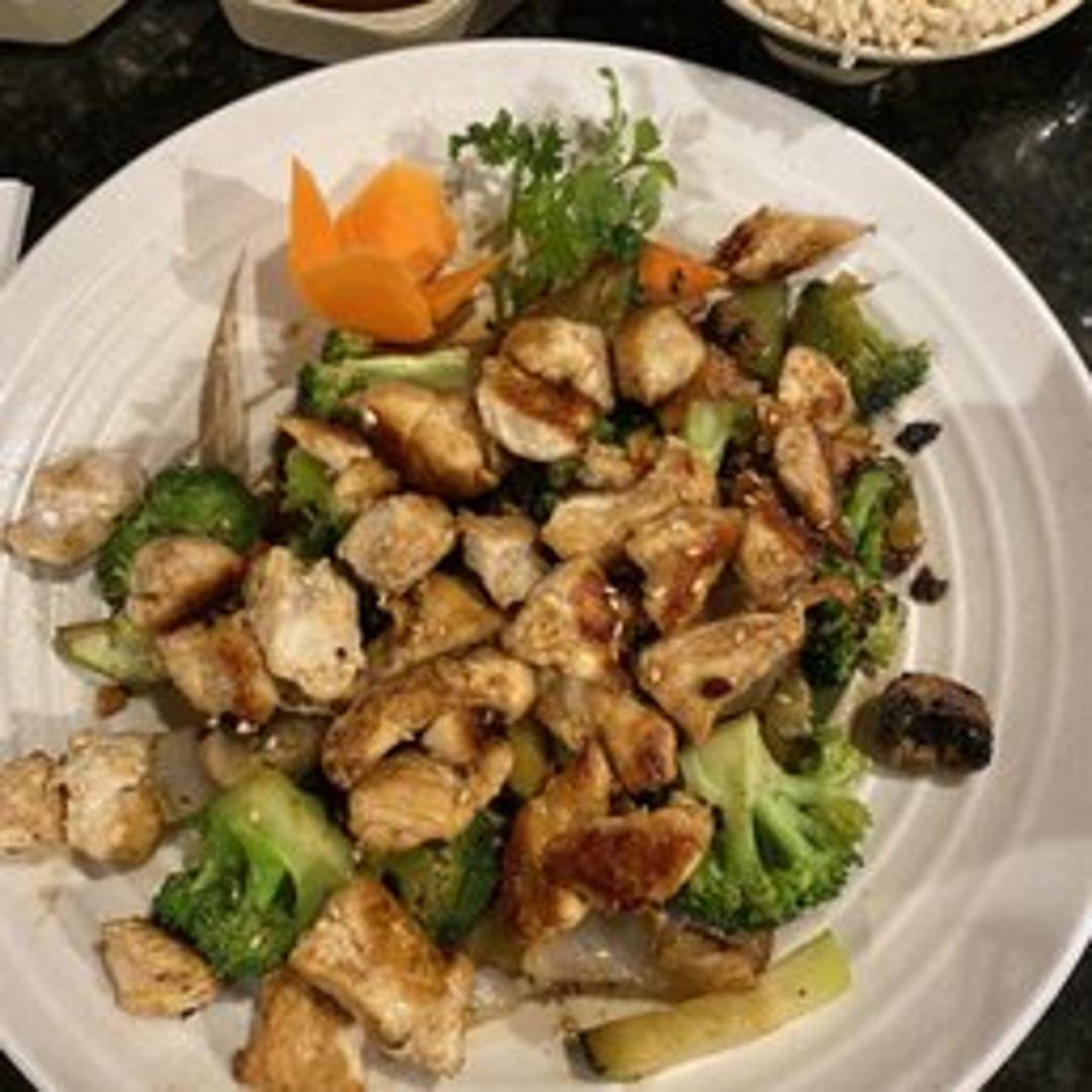 Grilled chicken prepared hibachi-style with a savory teriyaki glaze. Served with a side of steamed white rice and stir-fried vegetables. A flavorful and satisfying meal.