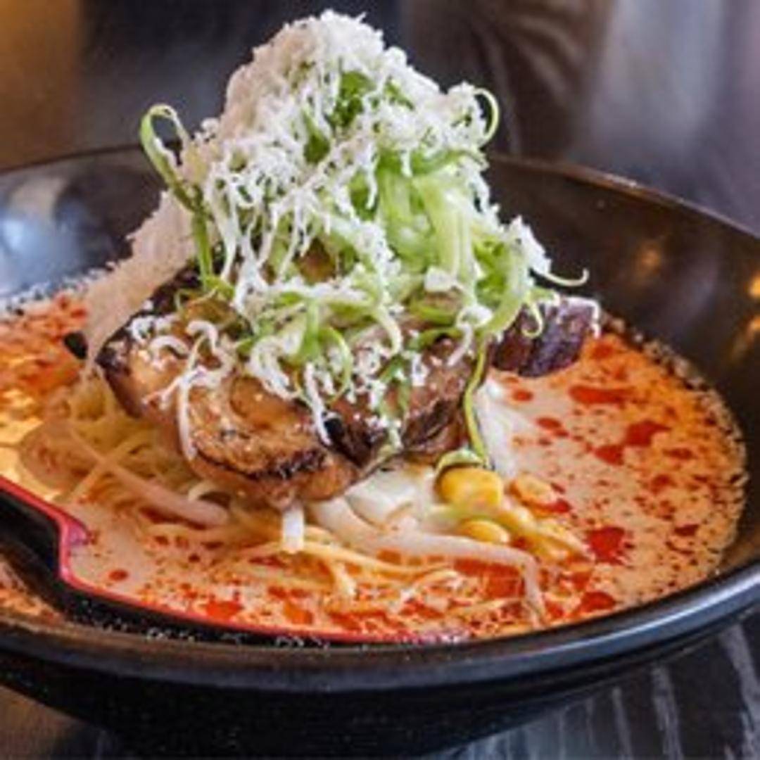 A rich and creamy ramen featuring a spicy broth, topped with melted cheese, noodles, and a variety of savory ingredients. May include vegetables, meat, and egg.