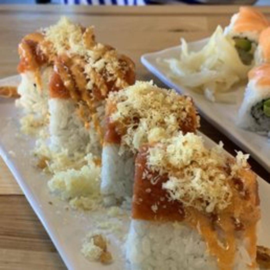 A generously sized sushi roll, likely featuring a combination of different proteins and ingredients, designed to satisfy a hearty appetite. Exact ingredients may vary.