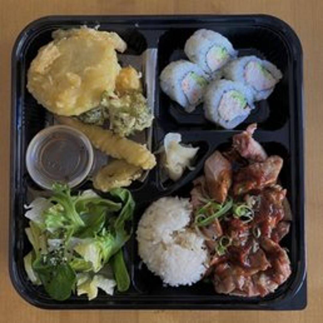 A Japanese-style lunch box featuring grilled chicken glazed with a sweet and savory teriyaki sauce. Typically served with rice, vegetables, and other side dishes.