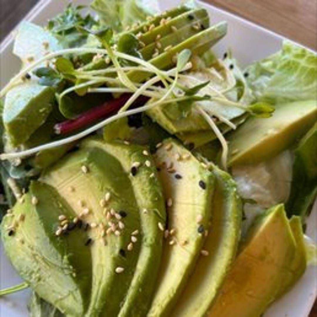 A simple and healthy salad featuring fresh avocado as the primary ingredient, combined with other vegetables, greens, and dressing. Exact ingredients may vary.