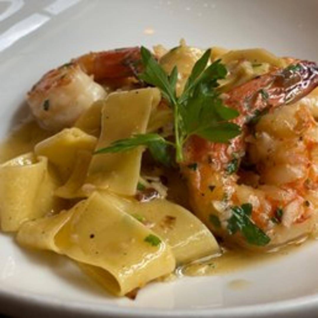 Shrimp sautéed with garlic, butter, white wine, and herbs, often served over pasta.