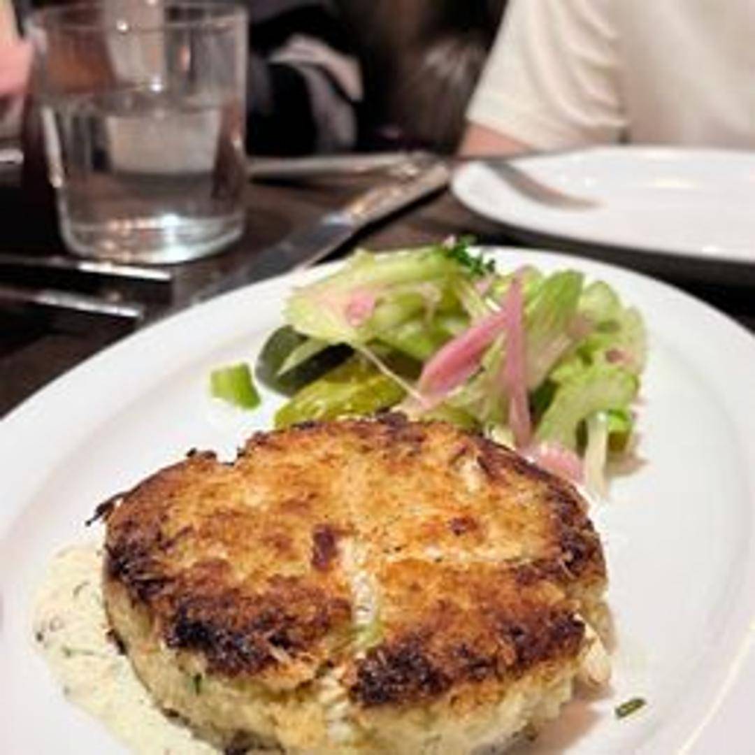 Jumbo lump crab cake, pan-seared to golden perfection, served with a remoulade sauce and a side of mixed greens.