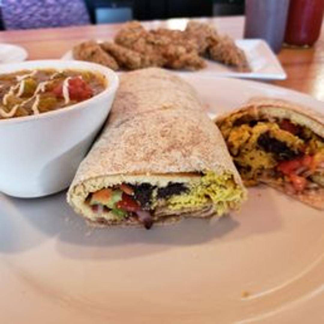 A veggie burger topped with house-made green chili, vegan cheese, lettuce, and tomato. Served on a bun.