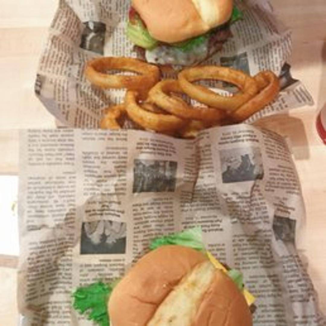 A juicy burger piled high with crispy onion rings, bacon, cheddar cheese, and BBQ sauce. A flavorful and satisfying meal.