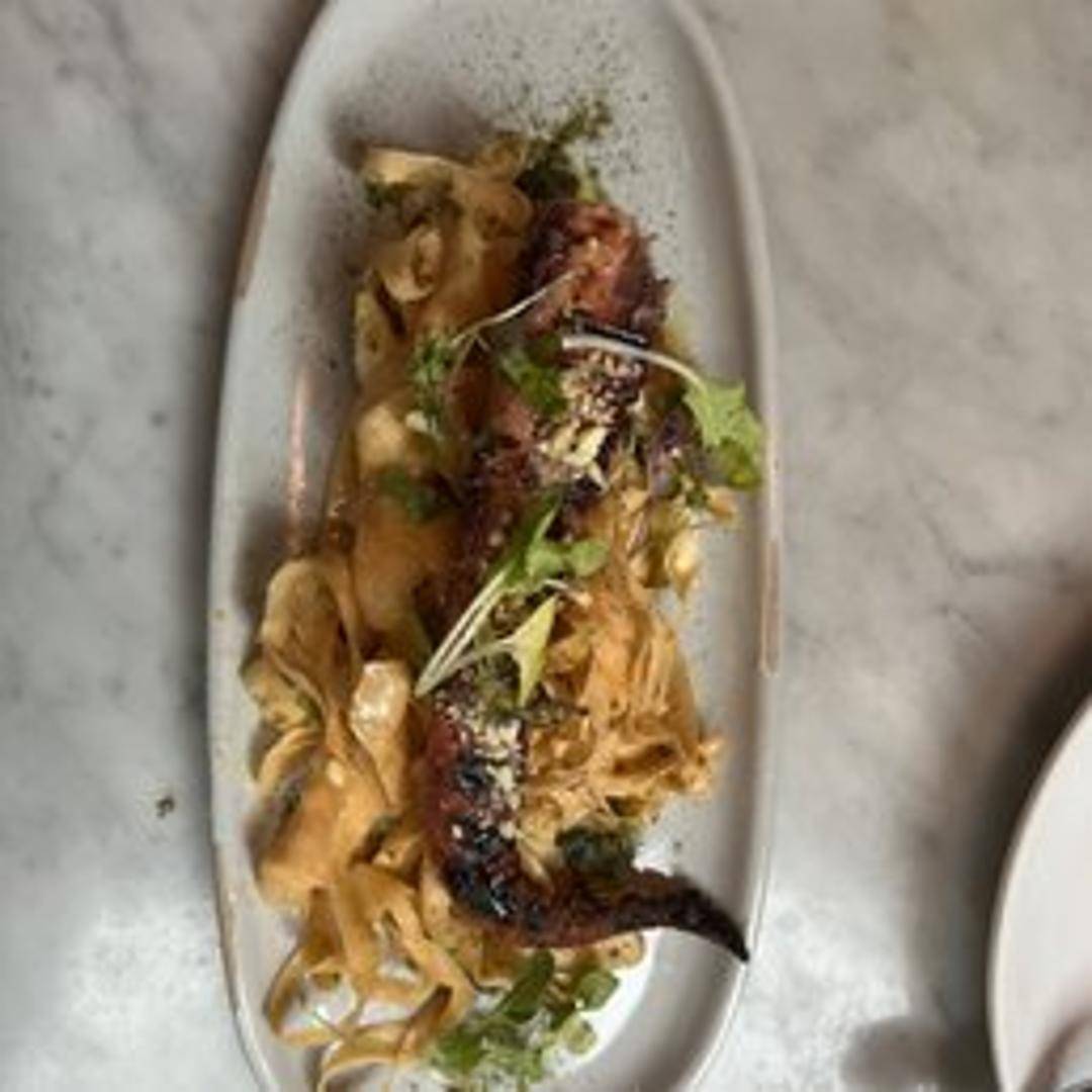 Tender and smoky octopus, grilled over wood for a unique and delicious flavor. A refined dish showcasing the natural taste of the octopus with a hint of char.