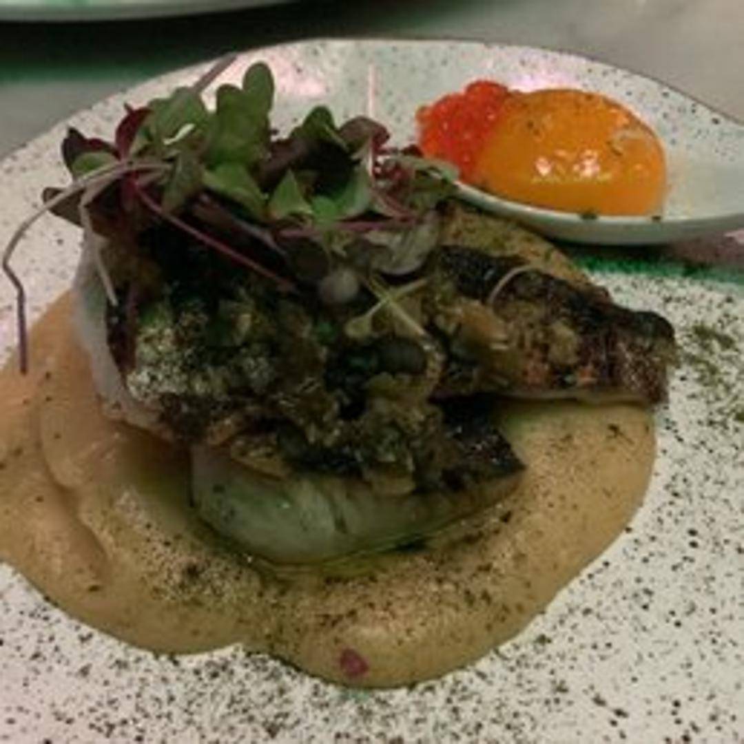 Slow-cooked char belly, roasted in a wood-fired oven for a smoky flavor and crispy skin. Served with complementary accompaniments that may include seasonal vegetables, flavorful sauces, and aromatic herbs. A rich and savory dish showcasing the char's natural textures and flavors.