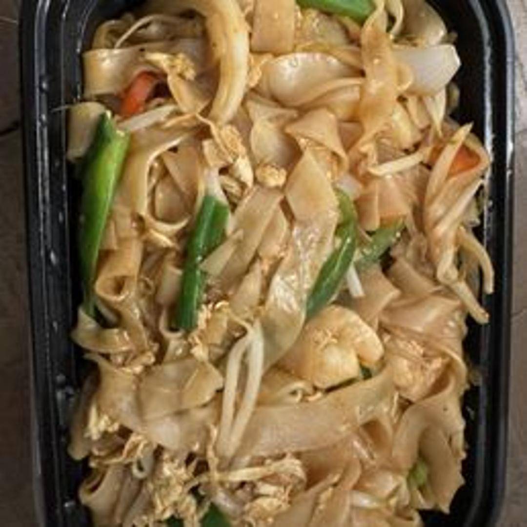 Wide rice noodles stir-fried with succulent shrimp and a medley of vegetables in a savory sauce.