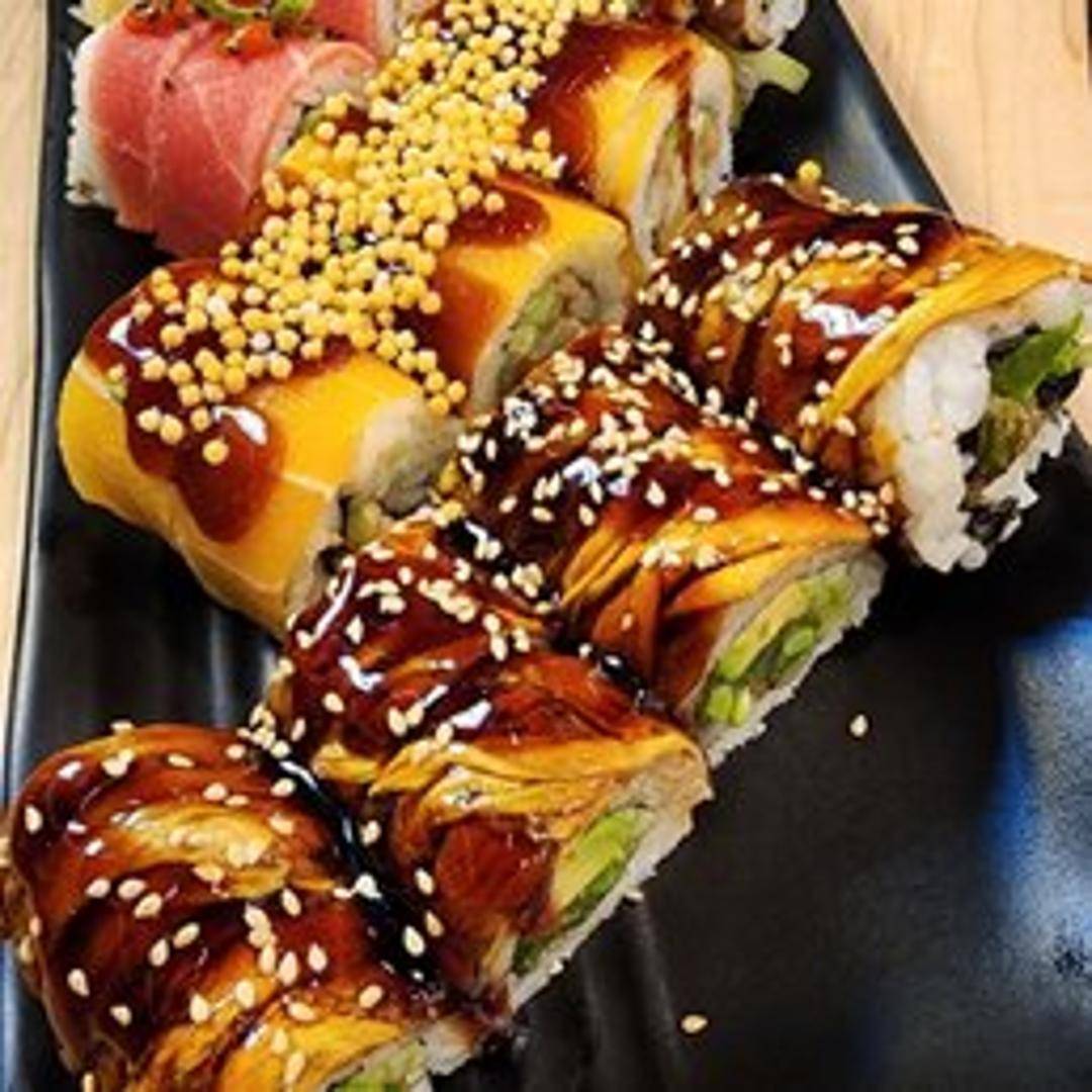 A delicious roll with fresh water eel, avocado, and cucumber and drizzled with unagi sauce.