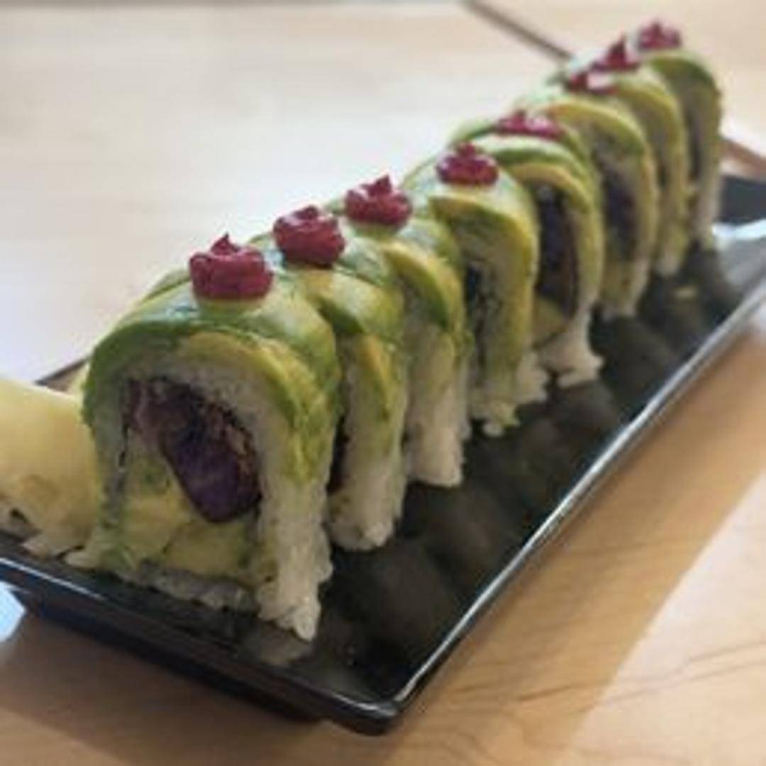 A tempura battered roll with potato, cream cheese and avocado and drizzled with unagi sauce.